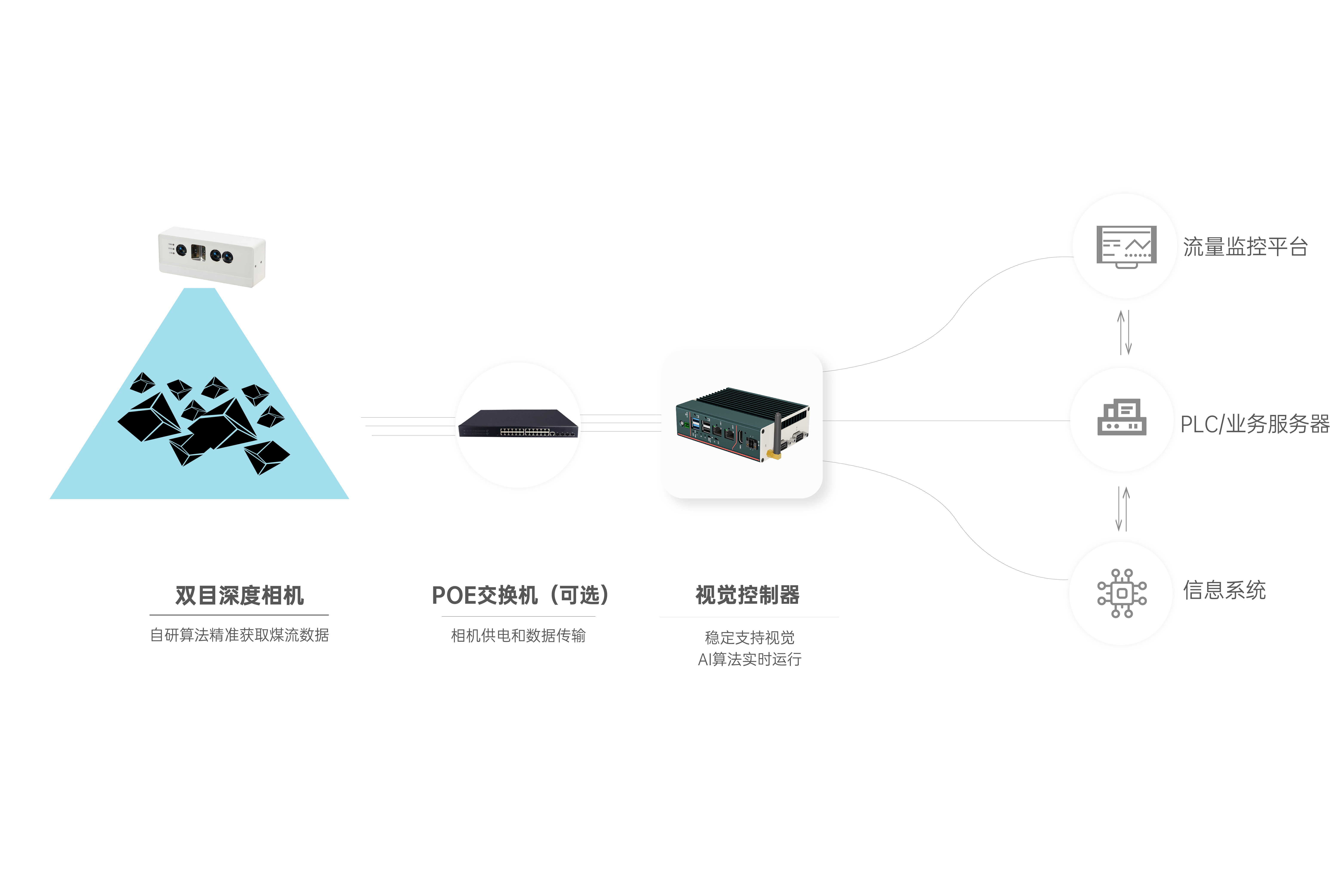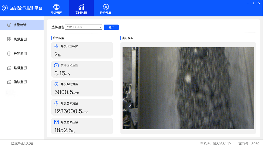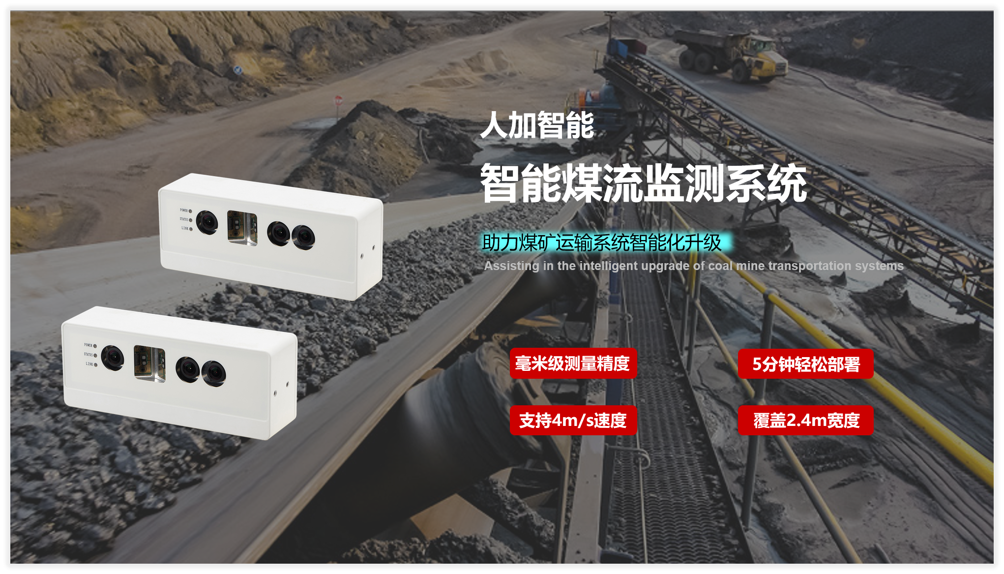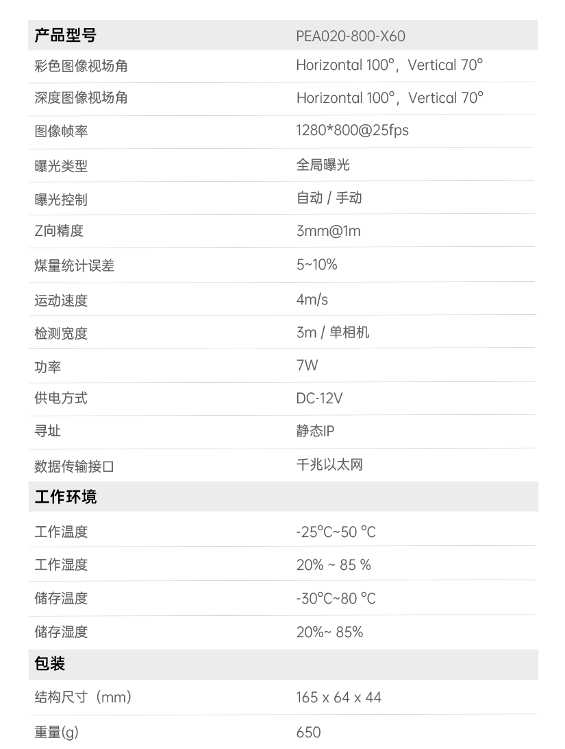 首页 动态 场景应用丨beat365智能智能煤流监测系统全新升级,赋能自动化煤流管控 场景应用丨beat365智能智能煤流监测系统全新升级,赋能自动化煤流管控 场景应用 2024-07-08 浏览量:2242 煤矿行业中,生产安全和节能降耗是两大痛点问题,在实际运煤过程中,跑偏、摩擦生热、堆煤、皮带撕裂等故障常造成重大安全事故,运输轻载和空载仍匀速运行会出现“以小拉大、无效运转”,导致能源大量浪费。 目前,传统测量设备智能化检测程度低,维护人员多,人力成本高,影响生产效率;皮带秤是采用较多的称重仪器,而在体积测量场景不易直接实现,而激光三维扫描测重系统价格昂贵,难以普遍使用。 如何通过提升皮带输送机采集精准数据能力,减人降耗,提高安全防范,进行自动化管控成为煤矿行业亟待解决的问题。 beat365智能智能煤流监控管理系统,基于双目立体视觉技术实现精准的数据检测和输送带控制。系统由3D相机硬件、嵌入式计算平台、流量监测平台构成,实现输送带煤量监测统计,堆煤监测、块煤监测、异物监测、跑偏监测、撕裂监测等功能,以采集的精准数据为智能调速、皮带运输安全检测等智能化改造提供助力,达到减人增效,节能降耗的目标。该系统环境环境适应强,部署简单,无需改造现场环境即可安装。 司眸®智能煤流监测管理系统应用于某煤流监测项目 产品介绍 beat365智能智能煤流监测管理系统采用自研非接触智能煤流RGBD相机,搭载输送机煤流监测智能管理平台,相机在AI算法加持下,能实时采集到高质量煤流RGBD数据,实现高速运输的煤炭皮带机进行多种智能化场景应用,易于部署,通过千兆网口直接对接PLC或服务器,安装便捷,无需改造现场环境,对环境光适应性强,不易受皮带颜色信息干扰。 系统应用功能 煤流统计 通过智能煤流RGBD相机采集动态输送机上的煤矿体积的三维数据,输出深度和彩色数据信息。该功能还可应用于输送带智能调速,生产数据管理,库存管理等智能化升级改造。 支持皮带速度:4m/s 粉煤煤量统计误差:≤5% 块煤监测 通过立体视觉技术,测量块状物的长宽数据,识别大块煤,输出高精度数据。 支持皮带速度:4m/s 异物监测 通过智能算法可识别大块矸石、铁器(锚杆、角钢)等非煤异物。 煤堆监测 在出料口、传送带上实时监测堆煤高度,实时输出堆煤结果。由此实现输送机安全监控,提前预防堆煤事故发生。 堆煤高度检测精度:毫米级 检测周期:秒级 最佳检测皮带宽度:600~2400mm 跑偏监测 根据智能相机安装位置定位皮带边缘位置,进行位置标定及设定跑偏阈值,通过获取的输送带三维尺寸位移信息,对皮带左右边缘位置与阈值比较并进行跑偏判断,输出跑偏结果。 左右皮带边缘定位精度:毫米级 检测周期:秒级 最佳检测皮带宽度:600~2400mm 智能煤流RGBD相机特点 01 高精度测量,保障数据准确 在高速动态检测上,测量精度可达毫米级,测量结果与实际煤量误差小于5%; 支持设备端断网续存,联网后相机前端与后台系统可保持数据同步。 02 适应性高,鲁棒性强,复杂场景可运行 抗强光、反光干扰:可抗强光、反光,自研算法支持煤矿等深色、黑色物体精准测量; 抗阴影干扰:在室内、地下、夜晚能稳定测量,无需补光; 多类型输送机适配:可适配平直型、U型、V型等各类型输送机; 适应于矿场粉尘、煤炭表面有水渍的情况; 结合算法对皮带输送时产生的震动进行自适应调整,减少测量误差; 针对井下场景可选用防爆硬件及井上应用工业级硬件设备,满足应用需求。 03 部署简单,安装便捷 出厂相机内参标定,可快速部署集成,无需改变现场环境即可安装,实施速度快,调试简单,系统易于维护。 04 接口丰富,数据直传 丰富的系统对接接口,可直接对接PLC、变频器、服务器,快速完成精细化皮带控制。 05 大景深、大视野,多范围应用 测量皮带宽度达2.4米; 测量煤堆高度达1.5米; 设备组合方案可支持更大视野。 05 边缘计算架构,实时测量 使用边缘计算架构,将多种智能算法在边缘端实现,保证数据实时传输。 RGBD相机参数 beat365智能深耕机器视觉领域近十年,垂直领域技术积累深厚,经过长期自主研发,现已推出系列体积测量方案,包括智能煤流监测管理系统、RGBD大货体积测量、动态包裹体积测量、静态包裹体积测量等,能够满足各领域不断增加的业务需求。 beat365一直秉持以服务客户为中心,将技术与产品创新作为对客户、行业和社会应尽的责任。未来,beat365智能将坚持科技创新,始终致力于数字化转型升级及智能化发展,促进全社会生产效益提升。 上一个:场景应用丨beat365智能3D视觉+AI深度学习,助超大型货物体积测量更准,更稳,更易用 返回列表 下一个:3D机器视觉可以完成许多2D机器视觉无法完成的任务。 更多新闻推荐 端到端 更易用丨beat365®散料运输动态监测与预警系统全新上市 新品上市 2025-02-20 小尺寸 更灵活丨beat3653D相机PEA020-800-Y80S上新,助力多场景智造升级 新品上市 2024-09-29 目前主流3D视觉技术各有什么优劣势?如何选择最Match的工业3D相机? 技术科普 2024-08-12 【最全选型攻略】挑选合适的工业相机,必须提前考虑12要素! 工业相机 2024-07-16 场景应用丨beat365智能3D视觉+AI深度学习,助超大型货物体积测量更准,更稳,更易用 场景应用 2024-06-04 超高读取 极致易用丨beat365智能发布RGBD动态包裹体积测量智能相机 新品发布 2024-04-26
